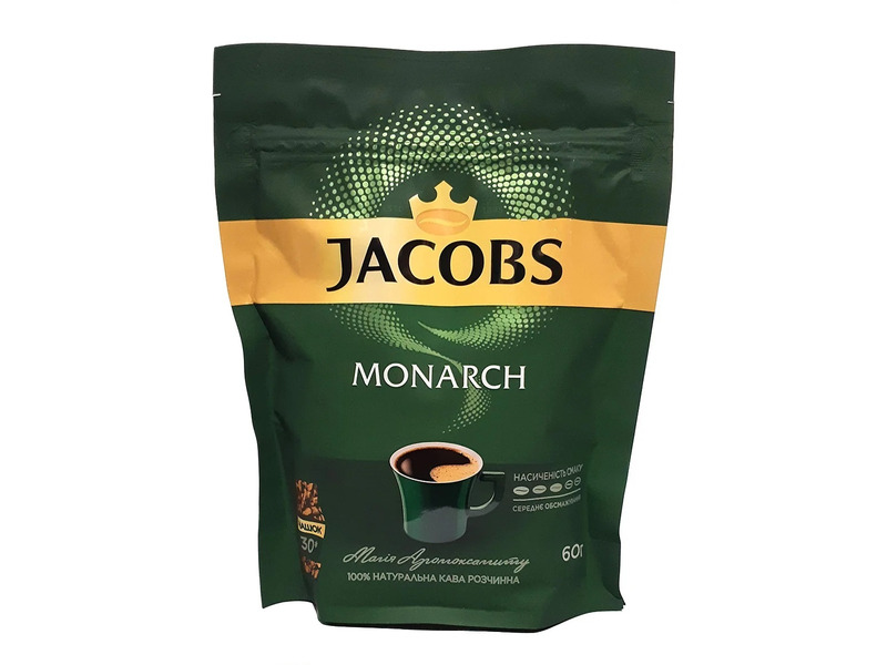 Сублимированный растворимый кофе Якобс Монарх (Jacobs Monarch) в упаковке 60 г – отличный пример сочетания достойного качества продукта и невысокой цены. Торговая марка Якобс давно известна настоящим ценителям этого бодрящего напитка. Компания Якобс более 20 лет работает на украинском кофейном рынке, что свидетельствует о высоком качестве продукции.
